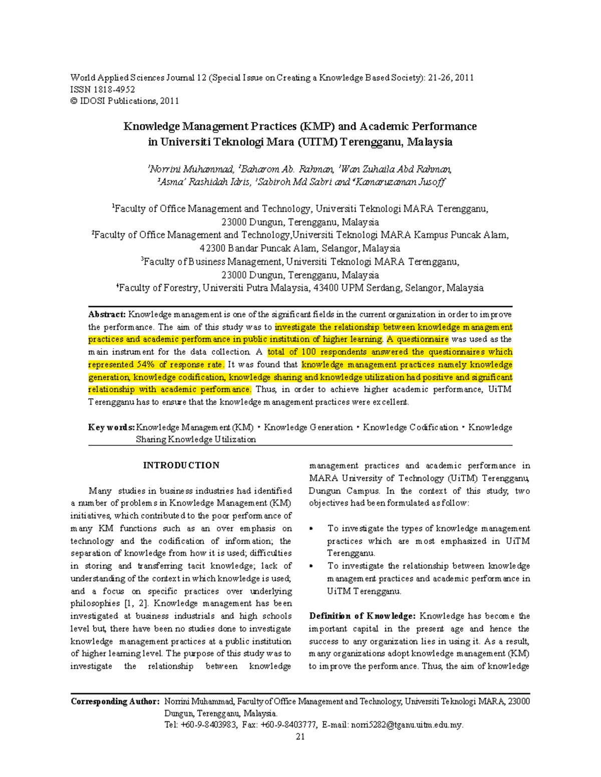 Bai 6 Knowledge Management Practices Kmp And Academic Performance In Universiti Teknologi Mara Studocu